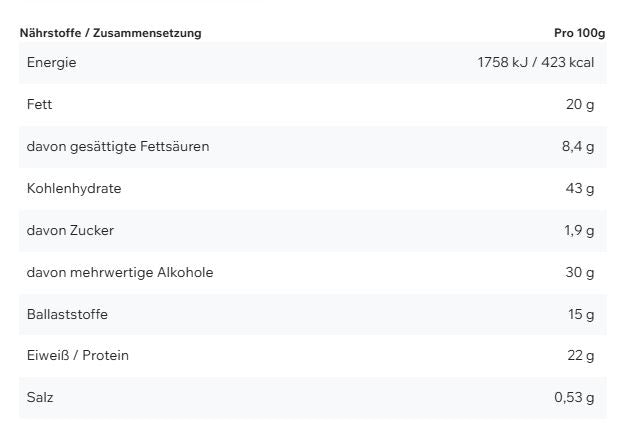 Fudge Brownie: Überzug (Süßungsmittel (Maltit), Kakaobutter, Oligofruktose, Kakaomasse, Reismehl, Emulgator (Lecithine (Sonnenblume, Raps), natürliches Kakao-Aroma, natürliches Vanille-Aroma), pflanzliche Proteine (Sojaprotein, Erbsenprotein, Reisprotein), Feuchthaltemittel (Glycerin), Polydextrose, geröstete Haselnussstückchen 6,5 %, Sonnenblumenöl, Aromen, Süßungsmittel (Sucralose).